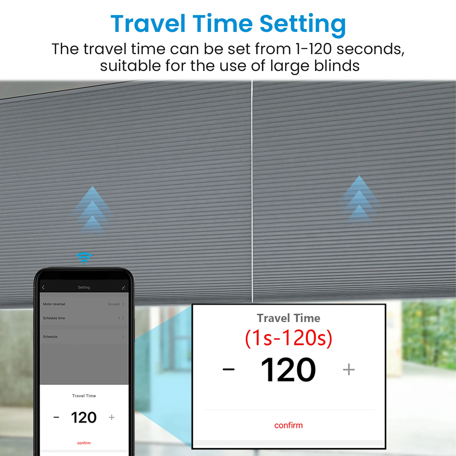 Impostazione del tempo di percorrenza - È possibile impostare rapidamente il tempo di funzionamento dell'interruttore 1s-120s nell'app in base alle proprie esigenze. Quindi puoi aprire la tenda al tempo di durata (1 ~ 120 secondi) di cui hai bisogno.